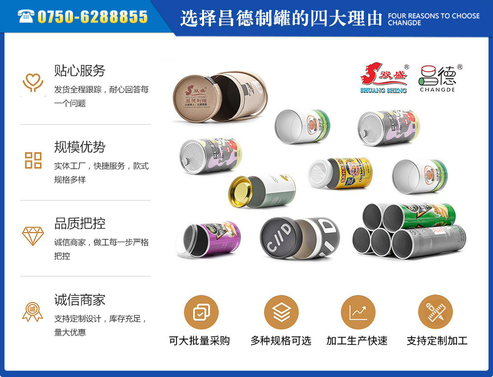 江門市昌德五金制罐有限公司位于江門與珠海臨近的古井鎮,是專業生產紙罐,食品紙罐系列的包裝研制、開發、生產的廠家,從建廠至今,公司本著“重合同、守信用”的原則,以“質量求生存,客戶至上”為經營宗旨,贏得了很好的信譽,公司擁有國內一流的技術設備和多年的生產經驗。年產休閑食品紙筒500萬左右,紙筒2000萬支左右,易拉罐,食品罐等1000萬左右,產品銷往各地。我廠是以高科技為先導,以技術創新整合為手段,成為迅速崛起的專業性包裝企業,憑借艱苦的創業精神和集體智慧,采用規范的現代企業運行機制,形成具有鮮明特色的企業文化模式和管理...